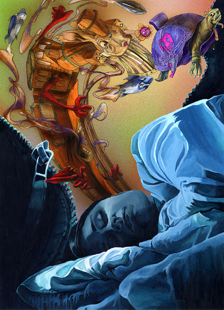 This is an illustration about a known fable (The Tortoise and the Hare) that takes on a different look when it enters a person's dreams. I used acrylics, markers, color pencils, and airbrush with metallic acrylic inks. Unfortunately, the scanner is, of course, unable to pick up the effect of metallic ink. I needed to touch up the top part of the illustration since the surface I used did not take color pencils very well. The surface was great for acrylic paint and ink but not so much for markers and color pencils. I used Photoshop to touch it up.